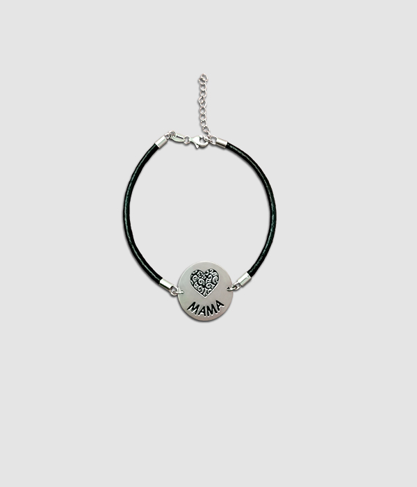 Pulsera plata+cuero (corazón mamá)
